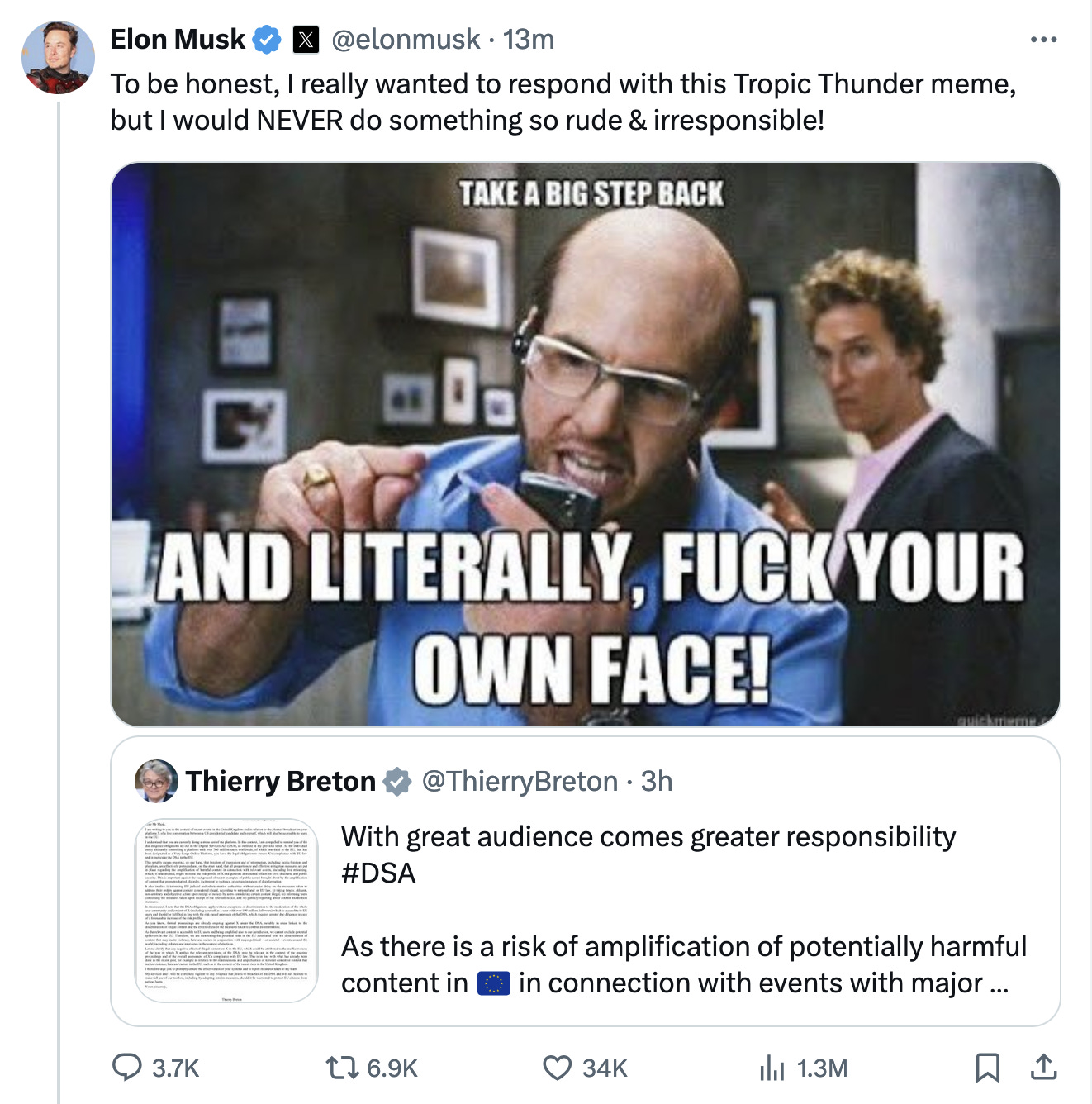 In a surprise move, an EU Commissioner sent a letter to Musk threatening him with legal action if he doesn’t prevent Trump from spreading “disinformation”. As always, I say that it is not government’s job to determine what is truth and fiction since they have a vested interest in those decisions.